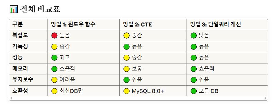 sql-- 가장 실용적이고 안전한 선택 -- 성능 + 호환성 + 가독성 균형🥈 2순위: 방법 1 (윈도우 함수)