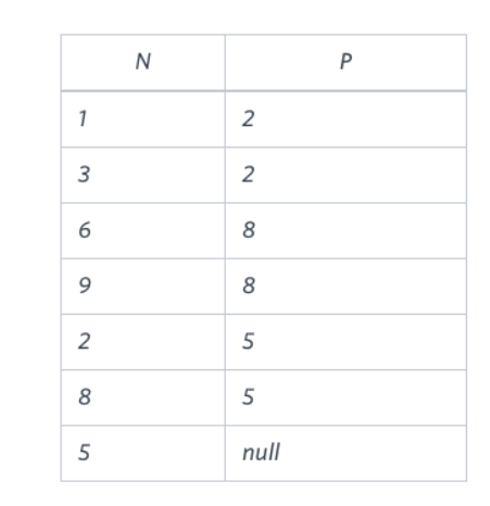 두 개의 열 N 과 P를 포함하는 BST 테이블이 주어졌습니다 . 여기서 N은 이진 트리 의 노드 값을 나타내고 P 는 N 의 부모입니다 .