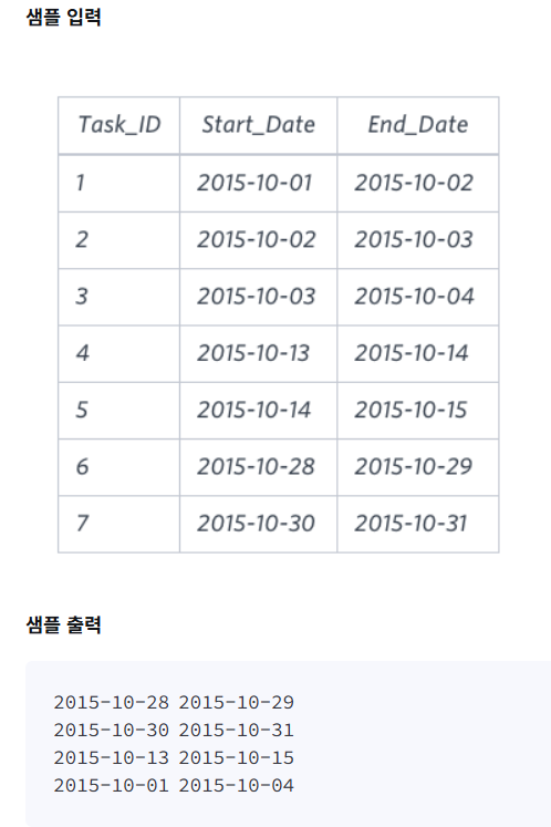 Task_ID , Start_Date , End_Date 라는 세 개의 열이 있는 Projects 테이블이 주어졌습니다 . 테이블의 각 행에서 End_Date 와 Start_Date 의 차이는 1 일 입니다 .