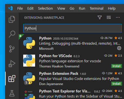 - ex) [Extension] -> Python(필요한 tool) 검색 -> 필요한 프로그램 설치 (설치하면 Uninstall 상태가 됨)