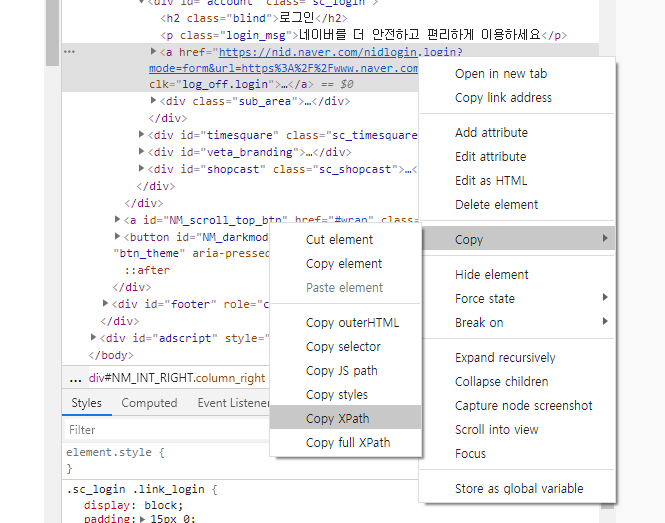 네이버 검색 사이트 로그인 Xpath 확인하기