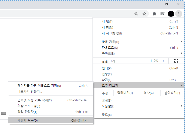 [크롬 맞춤 설정 및 제어] -> [도구더보기] ->[개발자도구]
