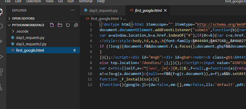 # 긁어온 page 자료 길이 확인하기 print(len(res.text)) # 긁어온 page 자료 확인하기 print(res.text) # 긁어온 page 자료 html로 저장하기 with open("first_google.html", "w", encoding="utf8") as f: f.write(res.text)