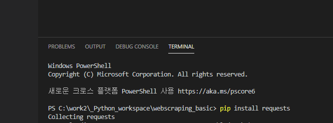 터미널 창에 pip install requets 치기 (requests 설치완료!)