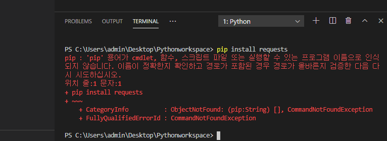 pip : 'pip' 용어가 cmdlet, 함수, 스크립트 파일 또는 실행할 수 있는 프로그램 이름으로 인식